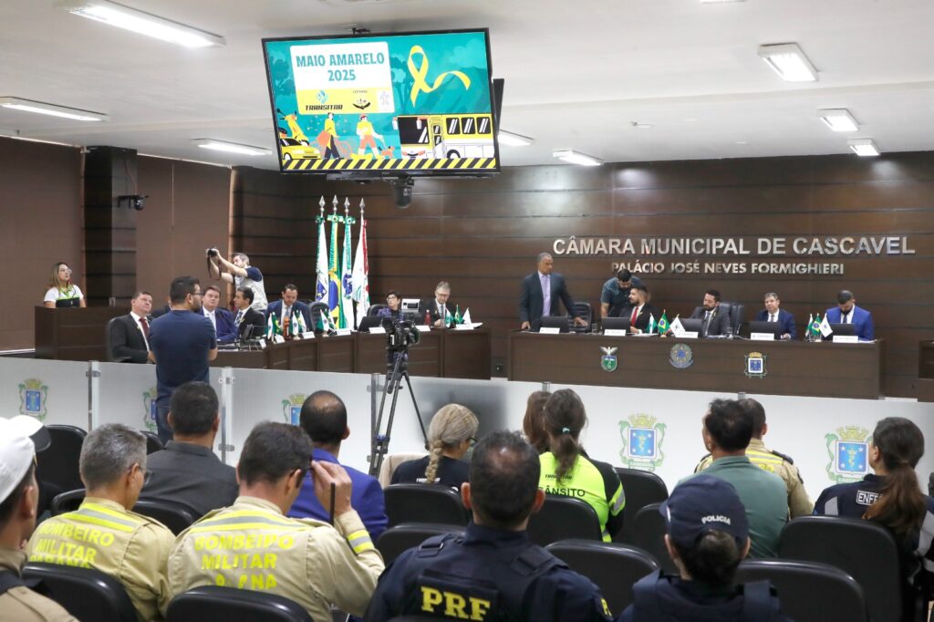 Foi aberta oficialmente nesta segunda-feira (5) a campanha Maio Amarelo em Cascavel. O evento, realizado na Câmara de Vereadores, reuniu, além de agentes da Transitar, autoridades ligadas ao trânsito, como representantes da Polícia Militar, Polícia Civil, Polícia Rodoviária Estadual e entidades parceiras.