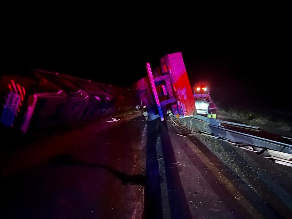 Com o impacto da colisão, a cegonha tombou no canteiro central, ocupando parte da pista. Já o caminhão de Votuporanga realizou um movimento em “L”, fazendo com que o semirreboque tombasse parcialmente e derramasse a carga de estruturas metálicas sobre a pista, causando o bloqueio total de uma das vias.