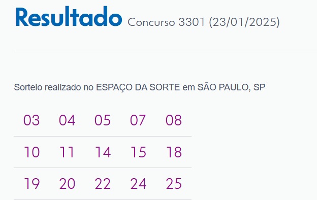 São Paulo (SP) – O concurso 3301 da Lotofácil, sorteado na noite desta quinta-feira (23), teve oito apostas ganhadoras do prêmio principal. Cada apostador vai receber a quantia de R$ 147.598,66. Uma dessas apostas foi feita na Distribuidora Lotérica Mourão, em Campo Mourão (PR).