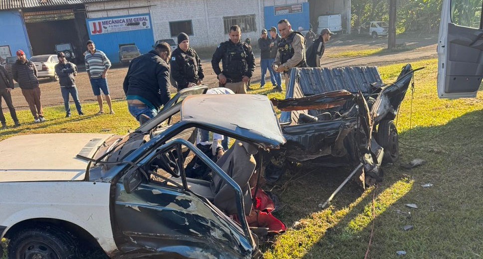 Com o impacto da batida, o veículo que cruzava a pista se partiu ao meio. Ainda não há informações sobre a gravidade dos ferimentos nos ocupantes dos dois automóveis. O Samu foi acionado para atender a ocorrência.