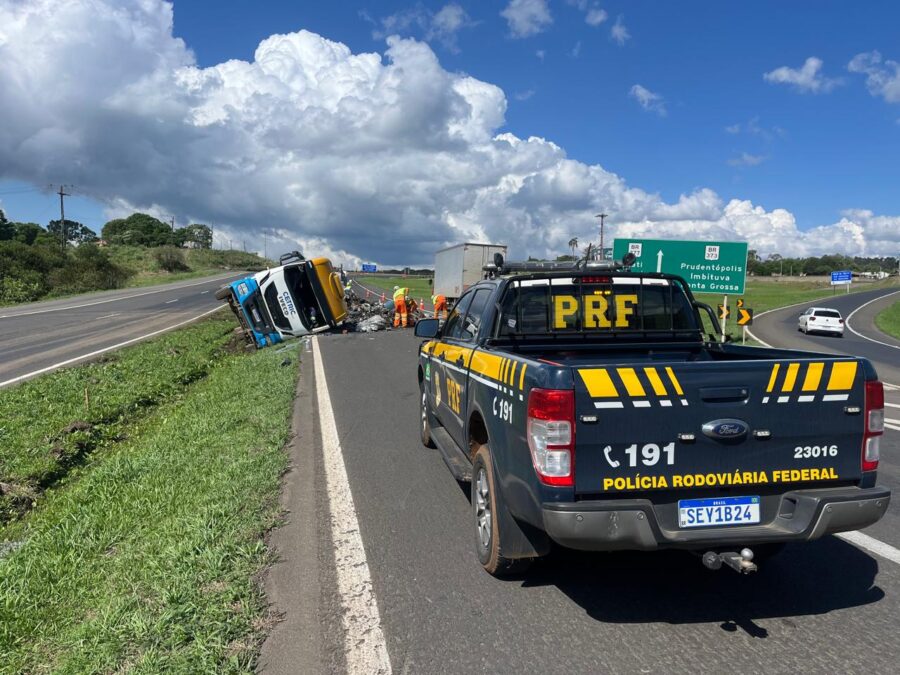 Um caminhão Iveco branco, com placas de Chapecó (SC), tombou na tarde desta segunda-feira (13) no km 298 da BR-277, em Prudentópolis, na região Centro-Sul do Paraná. O veículo, que tracionava um semirreboque carregado com lixo doméstico, saiu da pista e tombou por volta das 14 horas, deixando o motorista ferido.