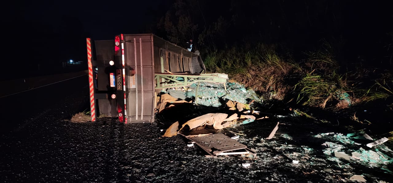 Oritigueira (PR) – A Polícia Rodoviária Federal (PRF) atendeu na noite de segunda-feira (5) uma ocorrência com vítima fatal na BR-376, km 309, no município de Ortigueira, região central do Paraná. O acidente aconteceu por volta das 19h e envolveu uma carreta do tipo CVC carregada com espelhos, que saiu do leito carroçável e tombou às margens da rodovia.