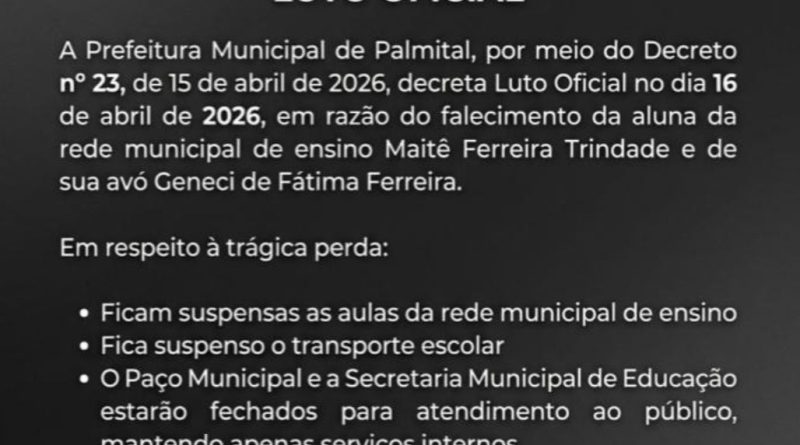 Read MoreMunicípio suspende aulas e serviços públicos nesta quarta-feira (16) em respeito às vítimas A Prefeitura de Palmital, no Centro-Sul do