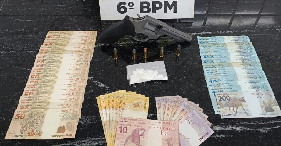Durante o patrulhamento, a equipe policial realizou a abordagem do automóvel e, na busca veicular, encontrou uma porção de cocaína, um revólver calibre .38 municiado e a quantia de R$ 2.600 em dinheiro. Diante do flagrante, o veículo e todo o material ilícito foram apreendidos.