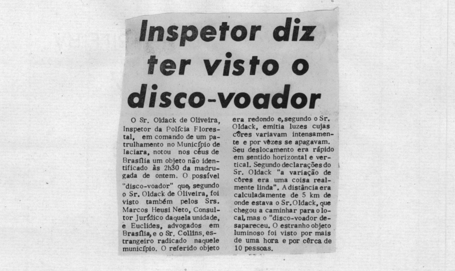 Em junho de 1969, um fato inusitado chamou a atenção dos leitores do Correio Braziliense. O inspetor Oldack de Oliveira, da Polícia Florestal, afirmou ter avistado um objeto não identificado nos céus de Brasília durante a madrugada.