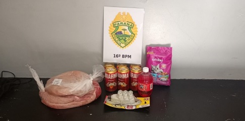 De acordo com informações repassadas pela equipe policial, ao chegar ao local, os policiais fizeram contato com um funcionário do estabelecimento, que relatou que um homem, de 59 anos, havia furtado diversos produtos. Entre os itens levados estavam 2,43 kg de carne bovina (alcatra), 1,550 kg de carne de frango, seis latas de cerveja Brahma, um corote de bebida alcoólica sabor cereja (marca 26), um pacote de ração para gatos (Whiskas, 500g) e uma extensão elétrica de 3 metros (marca Lucas).