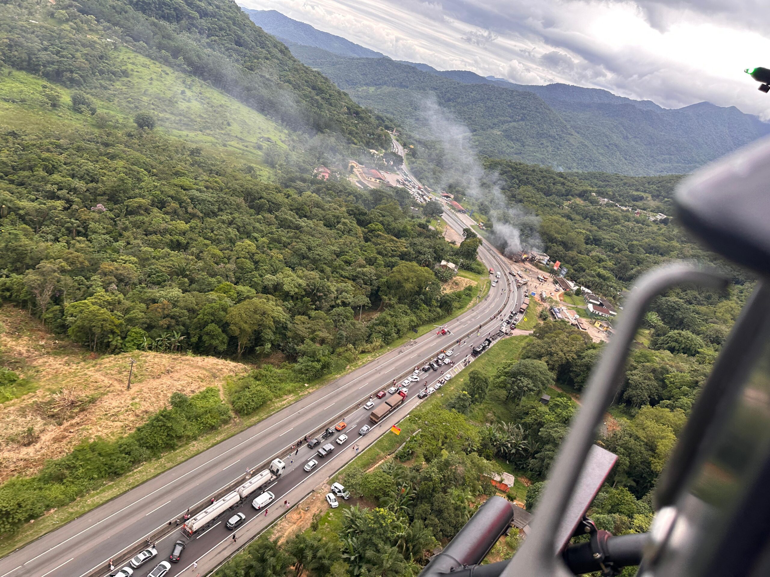 Curitiba (PR) – Imagens aéreas feitas pelo helicóptero da Polícia Rodoviária Federal mostram um caminhão em chamas após uma colisão com outro caminhão e dois automóveis na BR 277, na região metropolitana de Curitiba no sentido Litoral do Paraná.