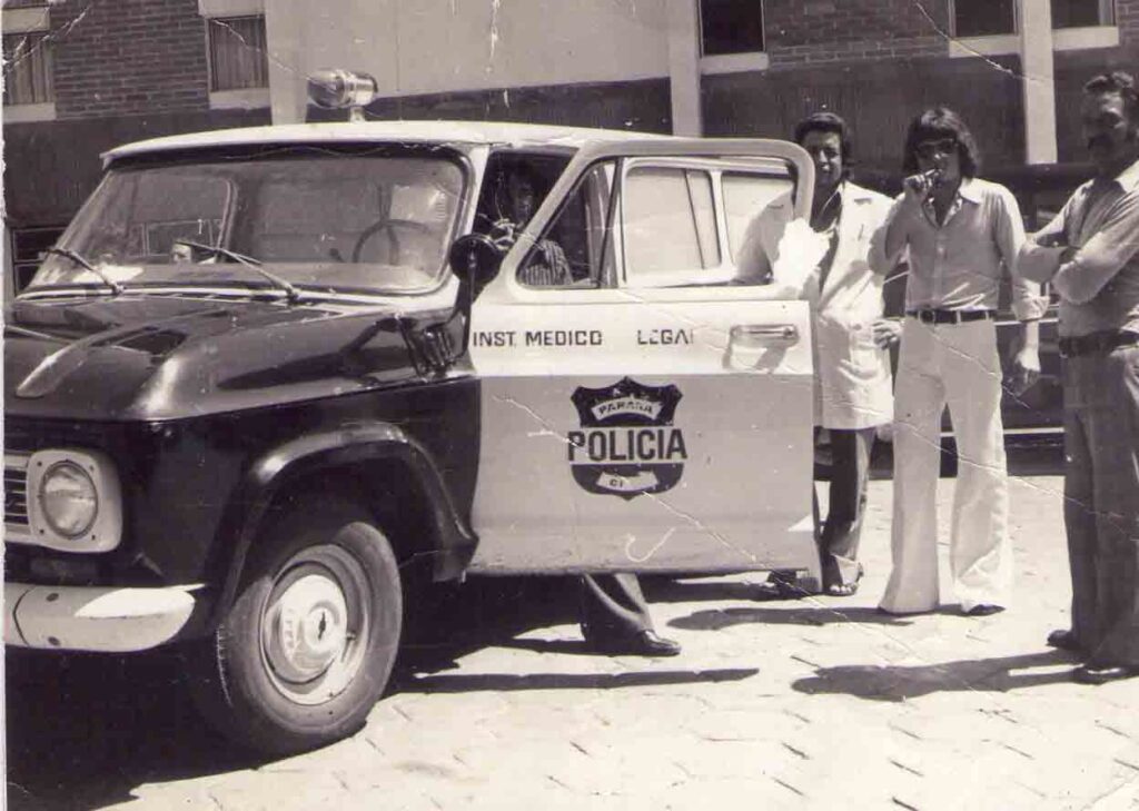 Na fotografia da segunda metade da década de 1970, observamos uma viatura do IML, modelo Veraneio da Chevrolet, e provavelmente alguns dos funcionários do IML em frente à sua sede.