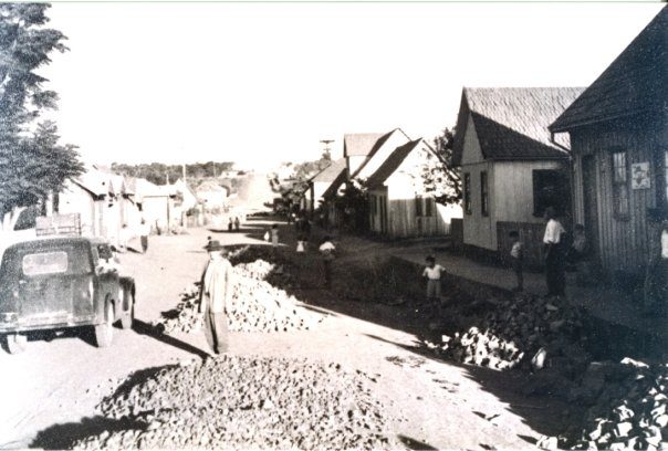 Foto histórica! Em 1954, começo do calçamento poliédrico de Cascavel, na Avenida Brasil a partir da atual Rua Pio XII em direção ao oeste. Na foto à direita é possível ver a Copal, seguido da casa do Itacir Luchesa, depois a casa do Nhô Jeca, os pioneiros de Cascavel.