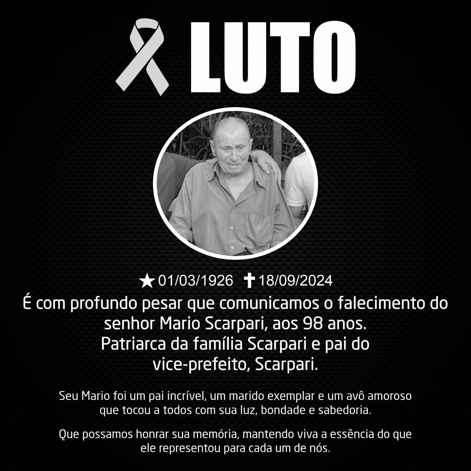 Laranjeiras do Sul (PR) – Faleceu nesta quarta-feira (18), aos 98 anos, Mario Scarpari, pai do vice-prefeito de Laranjeiras do Sul (PR), Valdemir Scarpari. Mario era uma figura respeitada e querida na região, deixando um legado de integridade e dedicação à família.