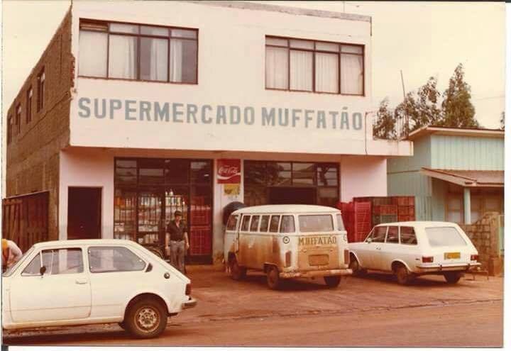 Considerada uma das maiores redes de supermercados e hipermercados do Brasil, o Muffato nasceu em Cascavel. Tudo começou em 1974, quando José Carlos Muffato (Tito), Pedro Muffato e Hermínio Bento Vieira montaram um armazém de secos e molhados no Neva. O presente registro é do primeiro supermercado da rede, em algum momento da década de 1970.