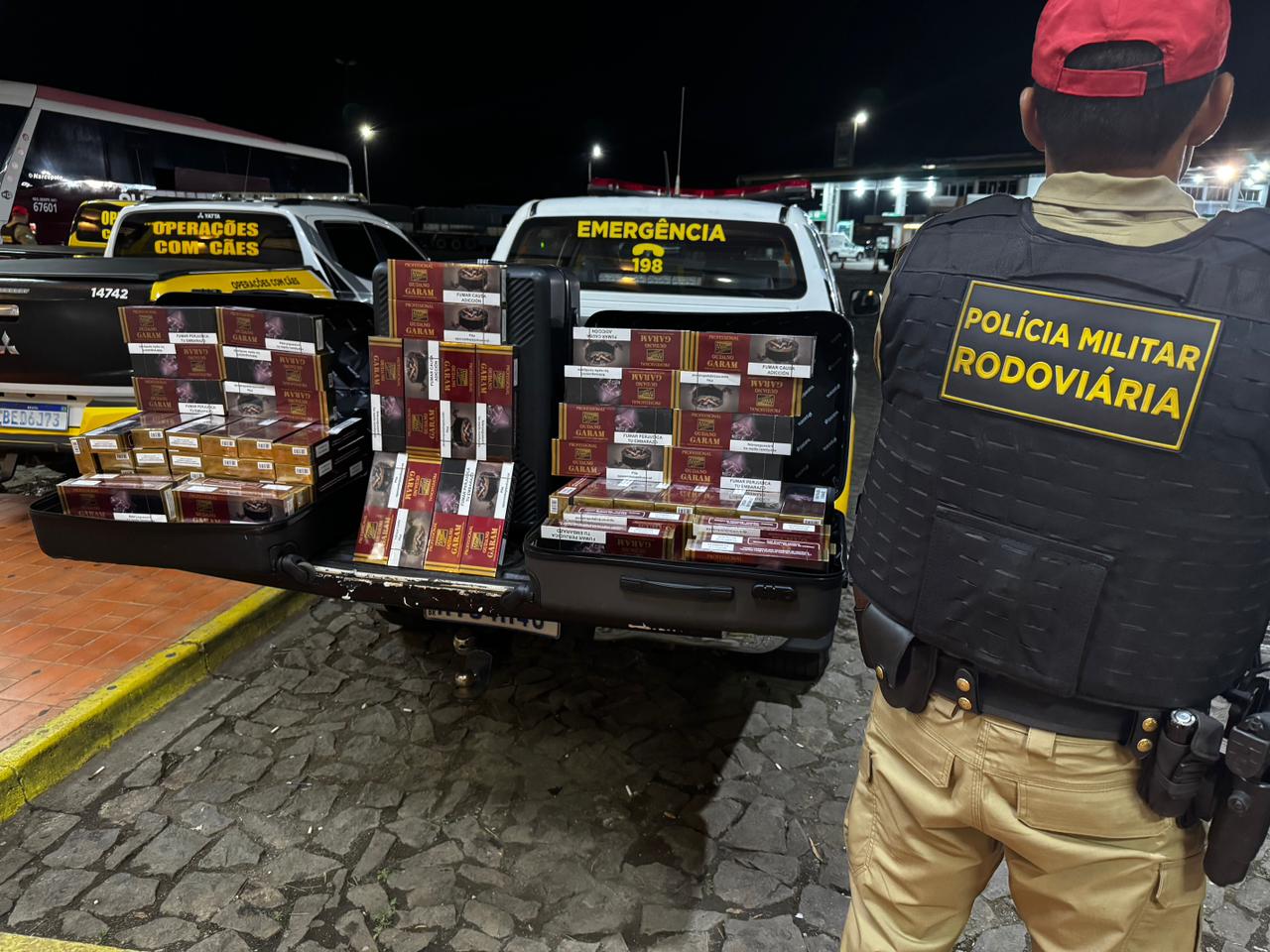Laranjeiras do Sul (PR) – Em uma ação conjunta realizada na noite de ontem (30) na BR-277, próximo ao município de Laranjeiras do Sul, a equipe do pelotão de operações com cães abordou um ônibus que fazia a linha Foz do Iguaçu a Florianópolis. Durante a vistoria, os policiais encontraram três malas no bagageiro do veículo, que, ao serem abertas, revelaram uma grande quantidade de cigarros de origem paraguaia, da marca Gudan Garang.