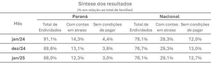 Reflexo desse comportamento mais controlado, a inadimplência também apresentou melhora expressiva. Enquanto a média nacional de famílias com contas em atraso foi de 29,1% em janeiro, no Paraná esse percentual foi de apenas 12,3%, o mais baixo da série histórica da pesquisa, iniciada em 2010. O estado agora ocupa a penúltima posição no ranking nacional de inadimplência, ficando atrás apenas da Paraíba.