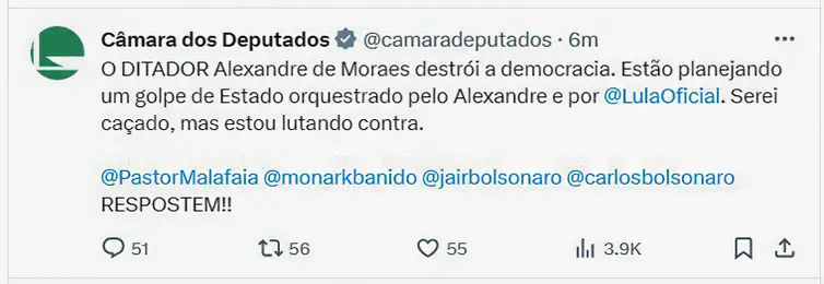 Brasília (DF) – O perfil da Câmara dos Deputados no microblog X, antigo Twitter, foi invadido na manhã deste sábado (10) e trouxe às 11h09 uma publicação que chama o ministro Alexandre de Moraes, do Supremo Tribunal Federal (STF), de “ditador”. A postagem foi apagada logo em seguida.