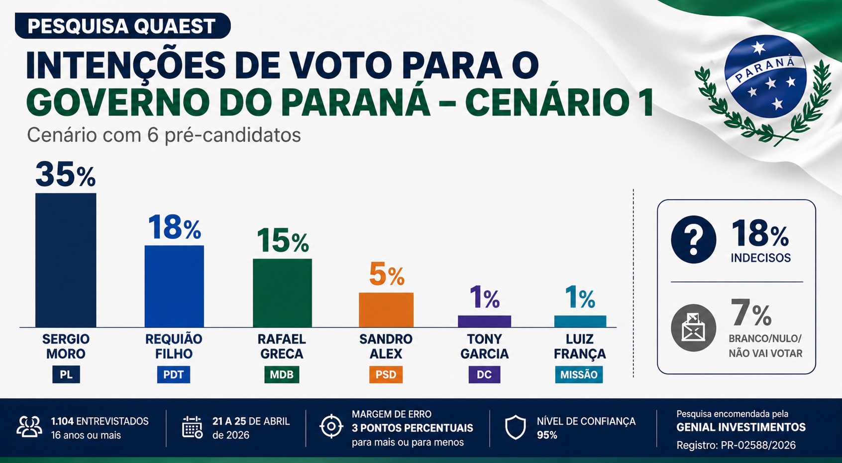 No primeiro cenário, com seis pré-candidatos, Moro aparece com 35% das intenções de voto, seguido por Requião Filho (PDT), com 18%, e Rafael Greca (MDB), com 15%. Já Sandro Alex (PSD) soma 5%, enquanto Tony Garcia (DC) e Luiz França (Missão) têm 1% cada. Indecisos são 18%, e 7% declararam voto branco, nulo ou ausência.