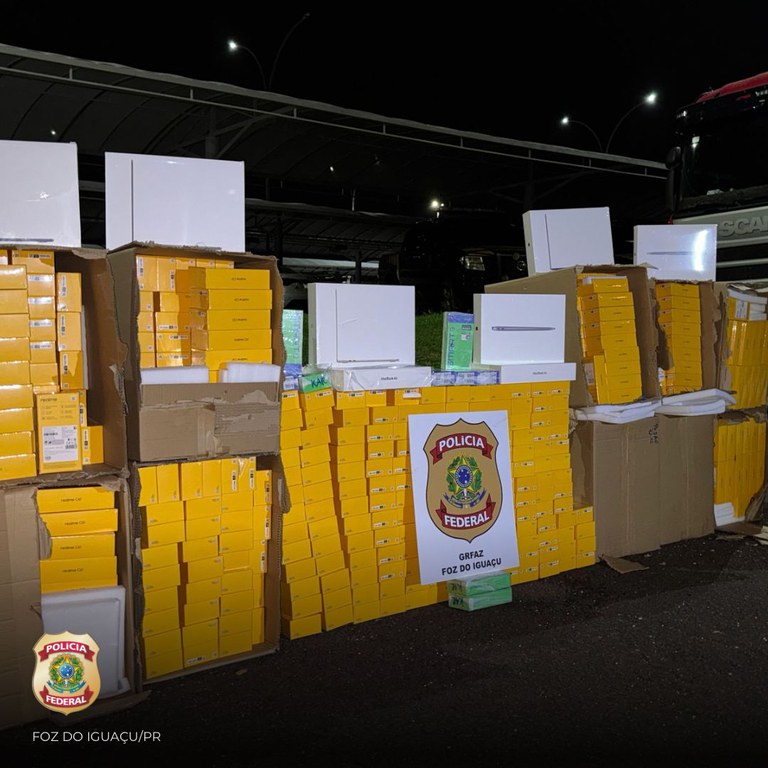 Foz do Iguaçu/PR – Policiais federais realizaram uma operação que resultou na prisão de duas pessoas e de milhares de aparelhos eletrônicos importados irregularmente do Paraguai, na tarde desta terça-feira (6/5), em uma empresa transportadora em Foz do Iguaçu.