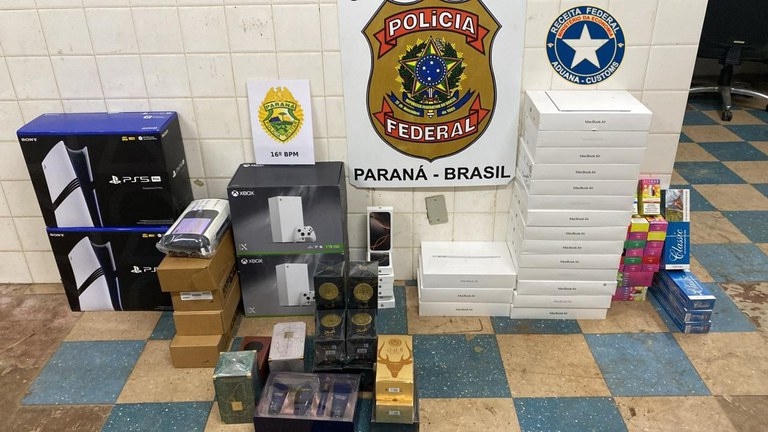 O flagrante ocorreu em posto de combustíveis na BR-277, em Guarapuava/PR, onde a equipe policial abordou o veículo ocupado pelos indivíduos. No interior do automóvel foram localizados, sem a devida documentação, 17 computadores, 7 smartphones, 8 videogames, 22 unidades de cigarros eletrônicos, 4 pacotes de cigarros estrangeiro, 15 unidades de cosméticos diversos e 3 sacos grandes contendo roupas.