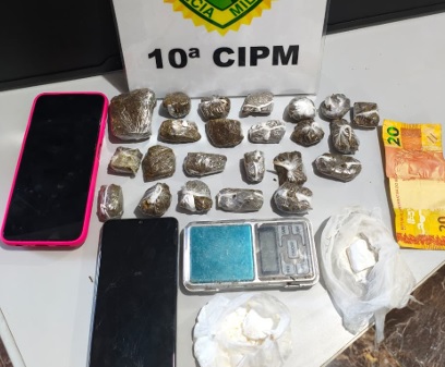 Na abordagem, os policiais encontraram uma sacola transparente com 210,2 gramas de maconha, além de um pote com mais porções da droga embaladas para venda. Também foram apreendidos dois invólucros de cocaína, totalizando 52,2 gramas, e uma balança de precisão.