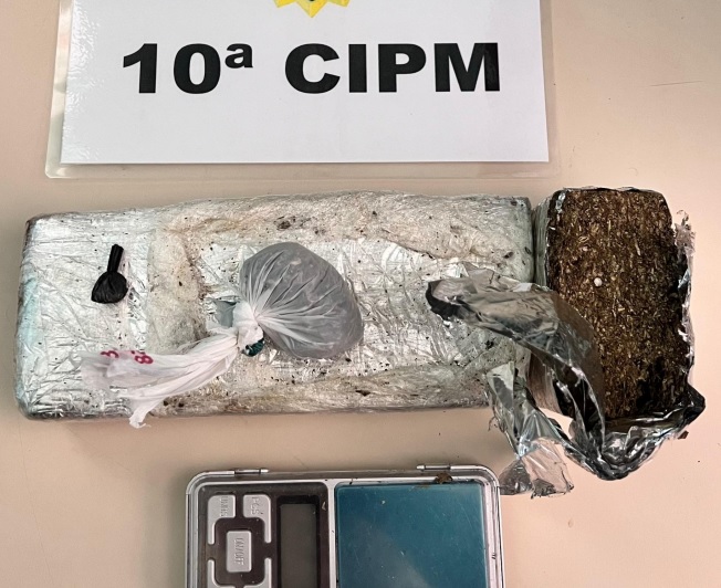 A equipe deslocou-se até o local e encontrou uma sacola contendo um tablete inteiro e outro fracionado de substância análoga à maconha, totalizando 639 gramas, além de uma balança de precisão e uma bucha de cocaína.