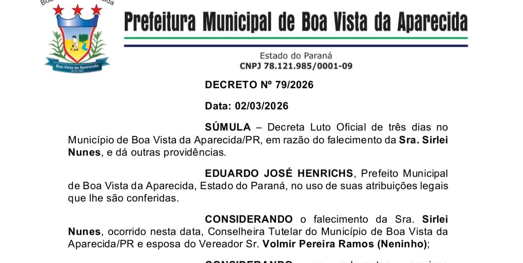 A Prefeitura de Boa Vista da Aparecida decretou luto oficial de três dias pelo falecimento da conselheira tutelar Sirlei Nunes. O decreto nº 79/2026 foi publicado nesta segunda-feira (2) e estabelece a medida em todo o território do município.