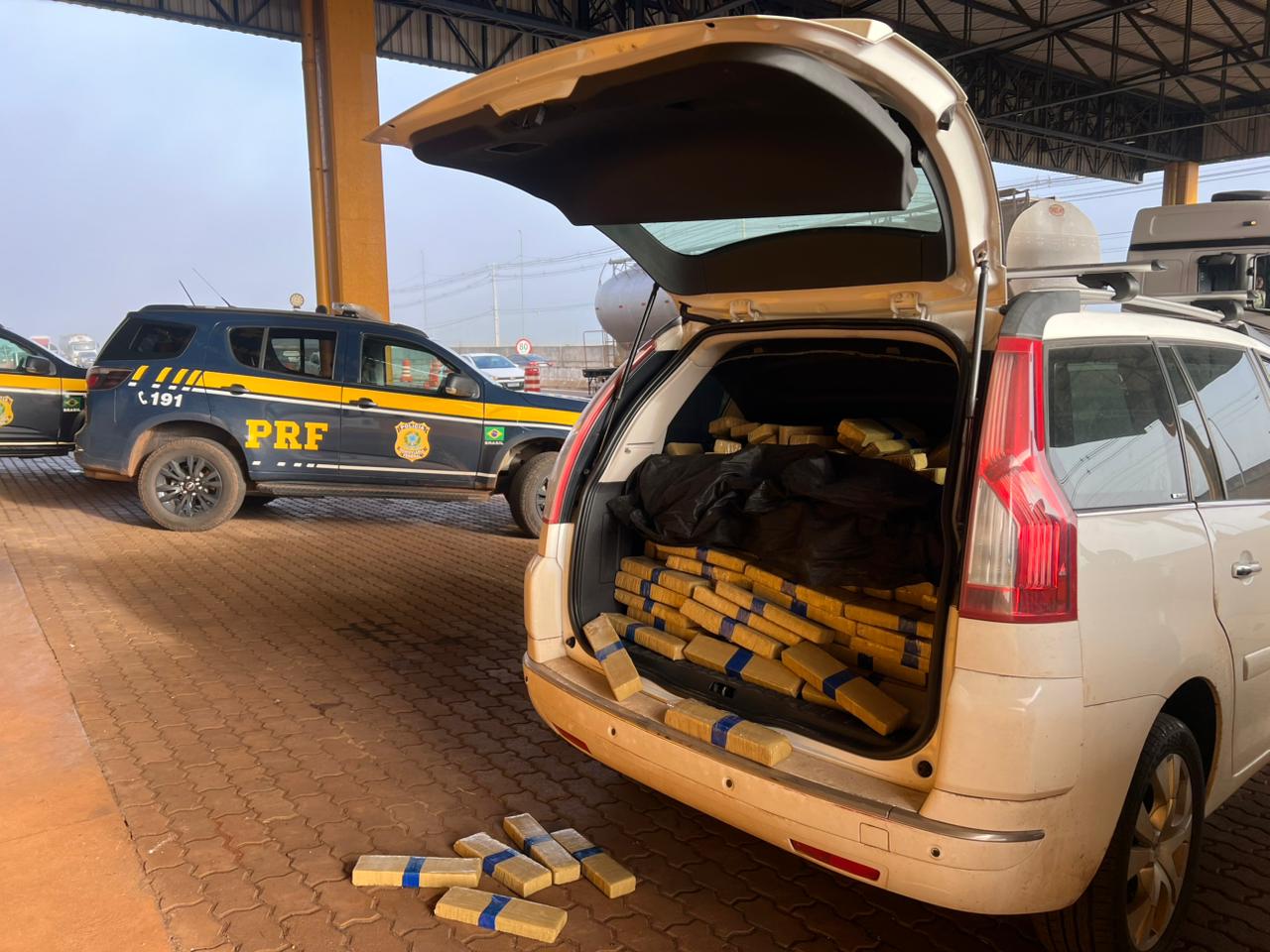 A Polícia Rodoviária Federal (PRF) apreendeu 385 quilos de maconha na manhã desta quinta-feira (11) durante fiscalização no posto operacional da BR-277, em Cascavel. A abordagem ocorreu por volta das 6h30, quando os agentes pararam um Citroën C4 Picasso ocupado por um casal.