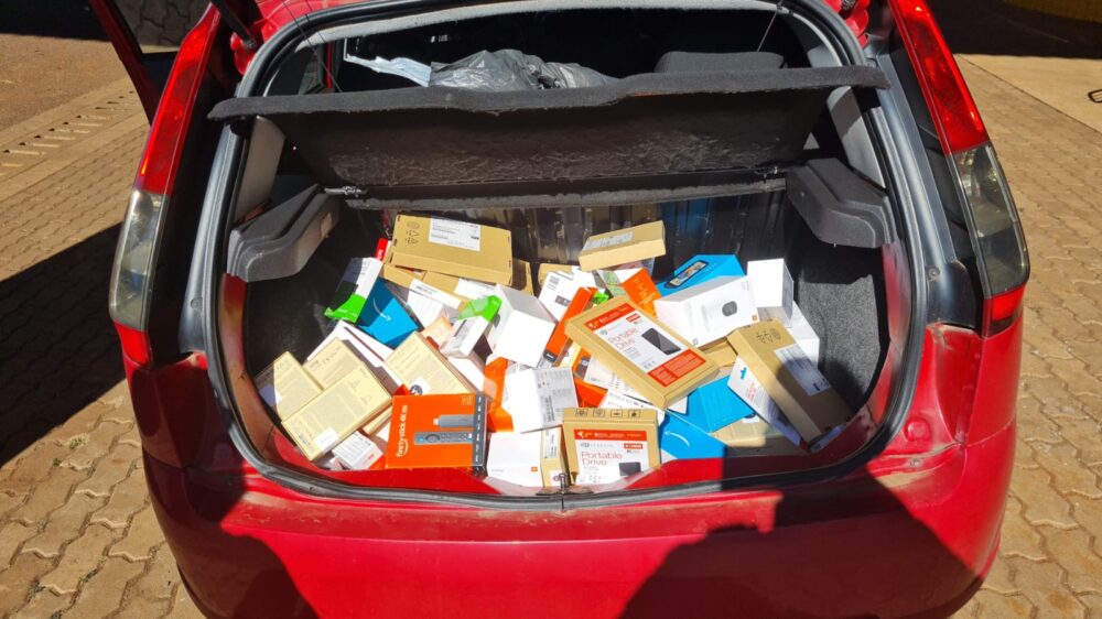 Os produtos estavam distribuídos em três veículos – dois Ford Fiesta e um Volkswagen Voyage – que viajavam juntos. Cada carro transportava cinco ocupantes. Entre os itens apreendidos estavam celulares, smartwatches, caixas de som, entre outros eletrônicos, todos em quantidade superior à cota permitida para importação e sem o devido pagamento dos impostos.