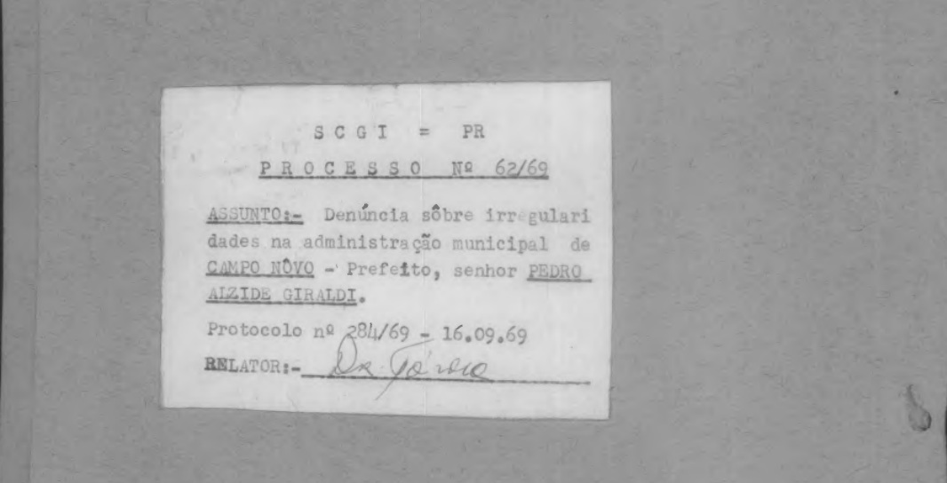 Um documento confidencial de 1969, emitido pelo Ministério da Justiça e pelo Comando da 5ª Região Militar, traz registros de denúncias e declarações sobre supostas irregularidades na administração do então prefeito de Campo Novo do Paraná (atual Quedas do Iguaçu), Pedro Alzides Giraldi. As informações constam em um processo remetido pela Subcomissão Geral de Inquérito (CGI), órgão que, durante o regime militar, apurava denúncias em administrações municipais em todo o país