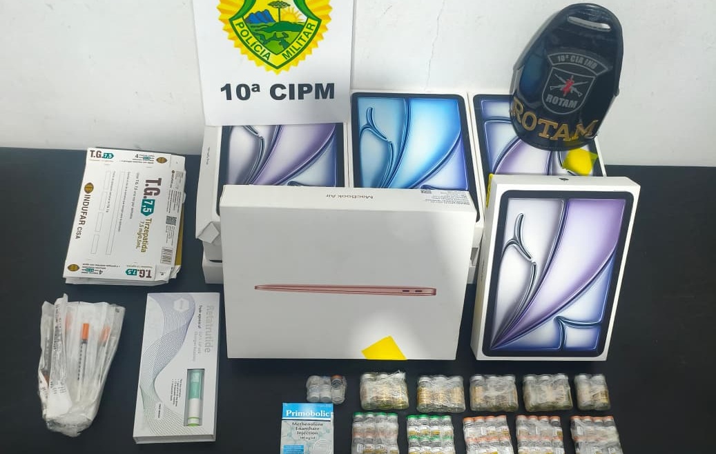 Em revista pessoal, nada de ilícito foi encontrado com os abordados. No entanto, durante a conferência das bagagens no interior do veículo, foram localizados 10 tablets, um notebook, 15 unidades de anabolizantes e 44 unidades de medicamento de uso controlado, todos sem a devida comprovação fiscal.