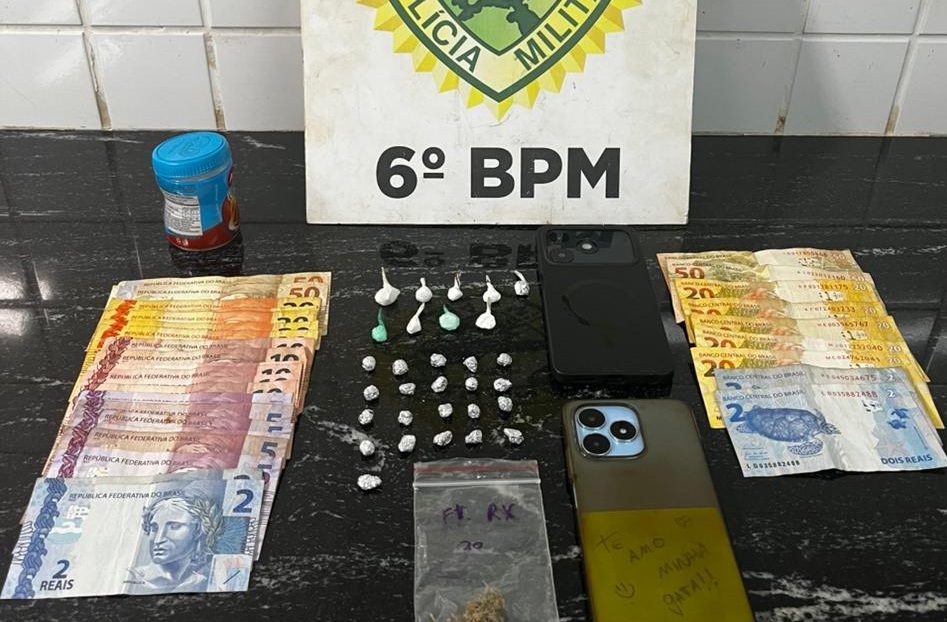 Durante a vistoria no interior da casa, os policiais localizaram um pote plástico contendo entorpecentes e dinheiro. No local foram apreendidas 21 pedras de crack, nove buchas de cocaína e uma bucha de maconha, além de R$ 538 em diversas notas.