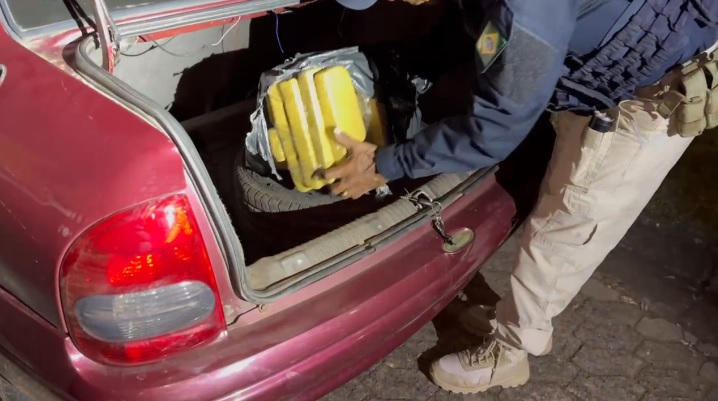 Em vistoria no Corsa os PRFs encontraram 15,7 kg de maconha no porta-malas, além de constatarem que esse automóvel ostentava placas falsas e que foi objeto de furto no dia 27 de março de 2025, em São Paulo.