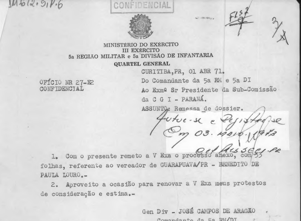 Um processo instaurado em 1973 pela Comissão Geral de Investigações (CGI) do Ministério da Justiça aponta que o então vereador de Guarapuava, Benedito de Paula Louro, foi investigado por supostos atos de corrupção administrativa e enriquecimento ilícito durante o exercício do mandato