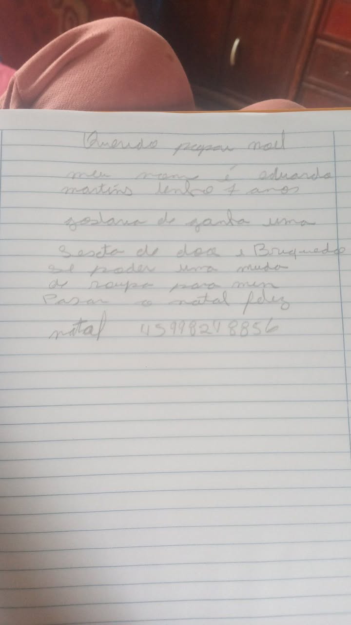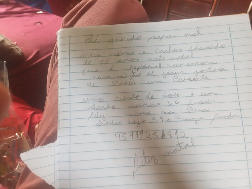 A outra cartinha foi escrita por Eduardo Martins, de 7 anos, que pede uma muda de roupa, uma cesta de doces e um brinquedo. Em poucas palavras, ele resume seu desejo: “Se puder uma muda de roupa para mim passar o natal feliz”. Para quem puder colaborar, o contato é (45) 99824-8856 falar com José.